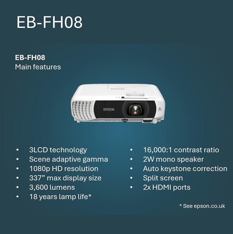 Epson EB-FH08 Projector Full HD 1080p, 3600 Lumens, 332 Inch Display Up to 18 years Lamp Life Home Cinema Projector