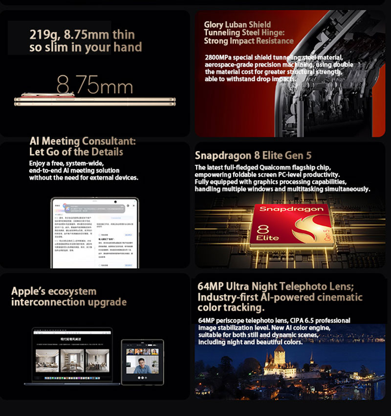 Honor Magic V6 5G Dual Sim Android 16 Snapdragon 8 Elite Gen 5 20.0MP + 20.0MP + Tri-lens Camera 7.95 inch + 6.52 inch OLED