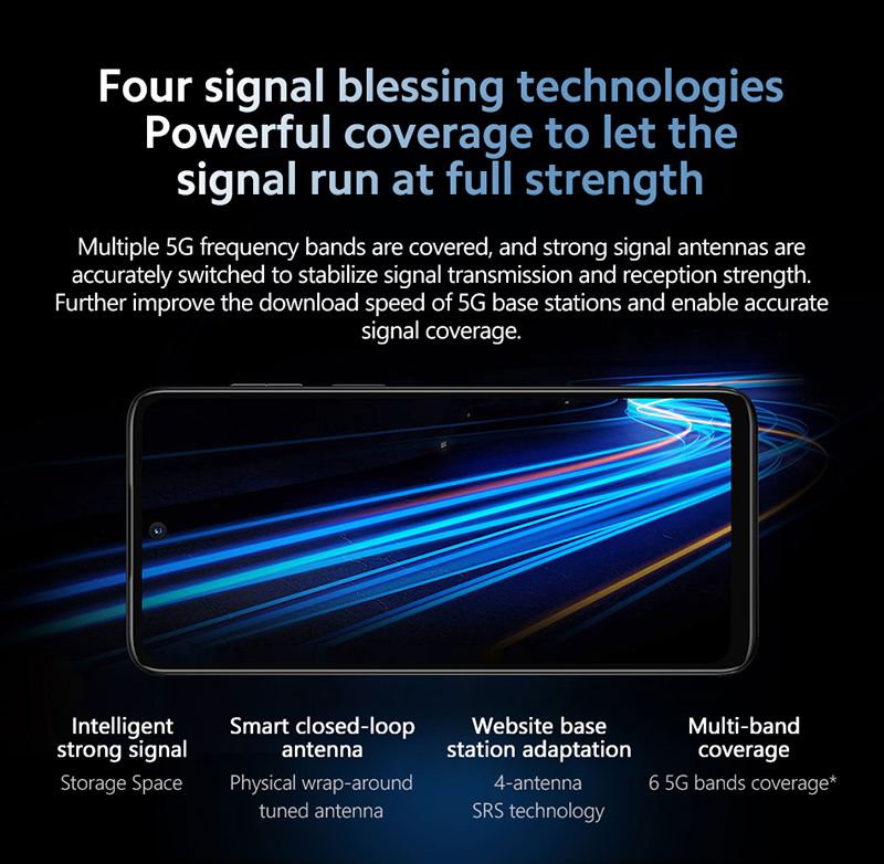 5G n1 (2100)、n5 (850)、n8 (900)、n28 (703MHz~733MHz)、n41 HPUE (2496NHz - 2690 MHz)、n78 HPUE (3300MHz~3800MHz)